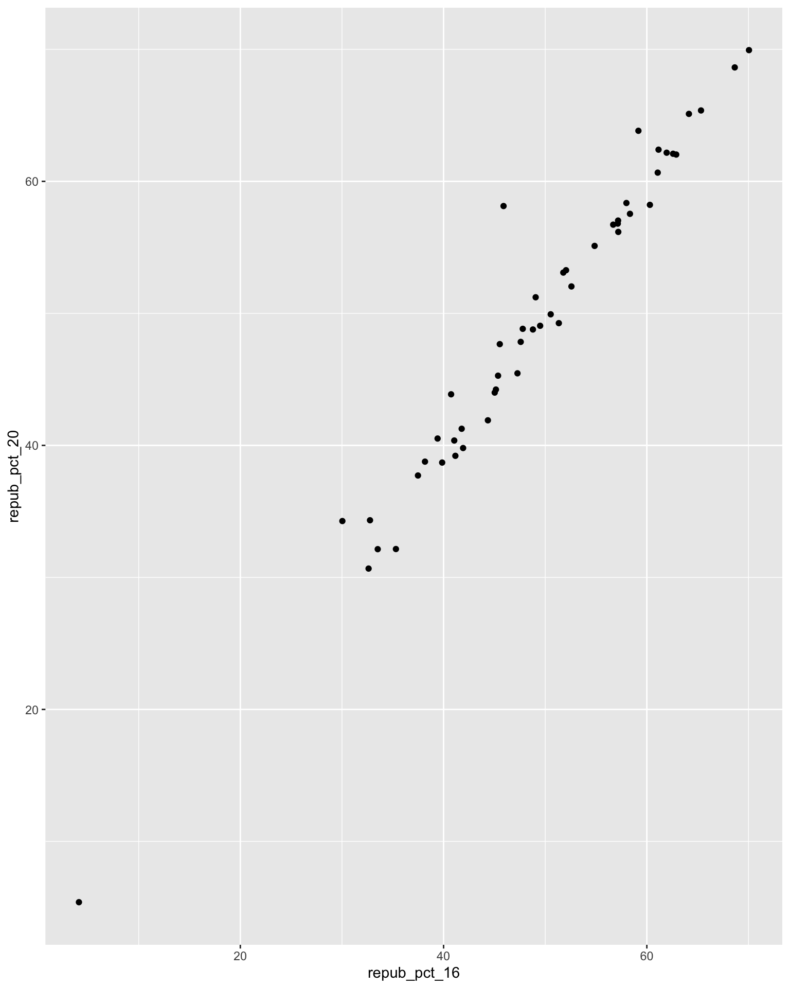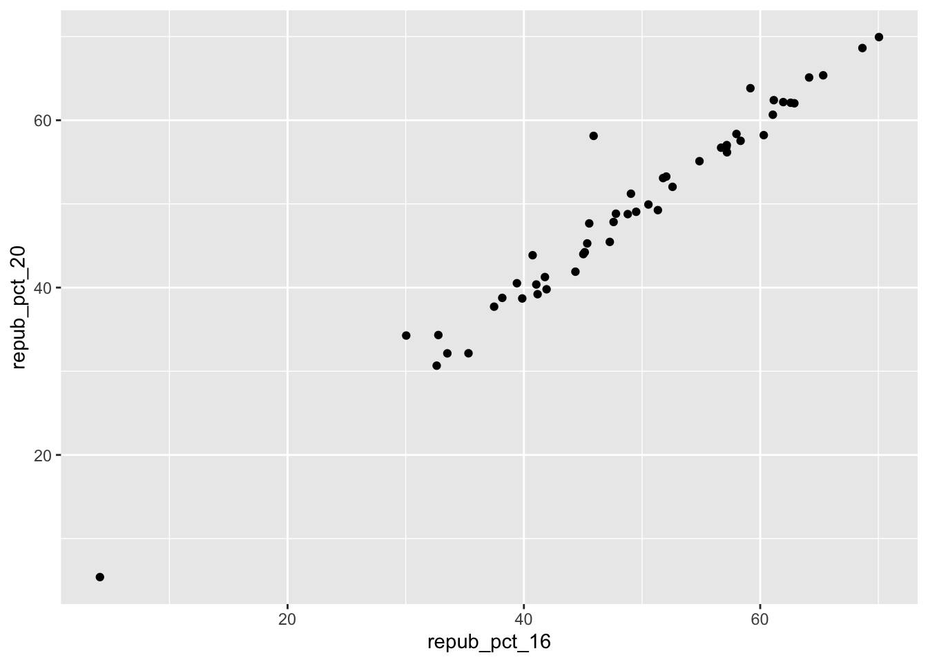 elections_by_state <- read.csv("https://mac-stat.github.io/data/election_2020_by_state.csv")For example, we might make a scatterplot of the 2020 vs 2016 outcomes: