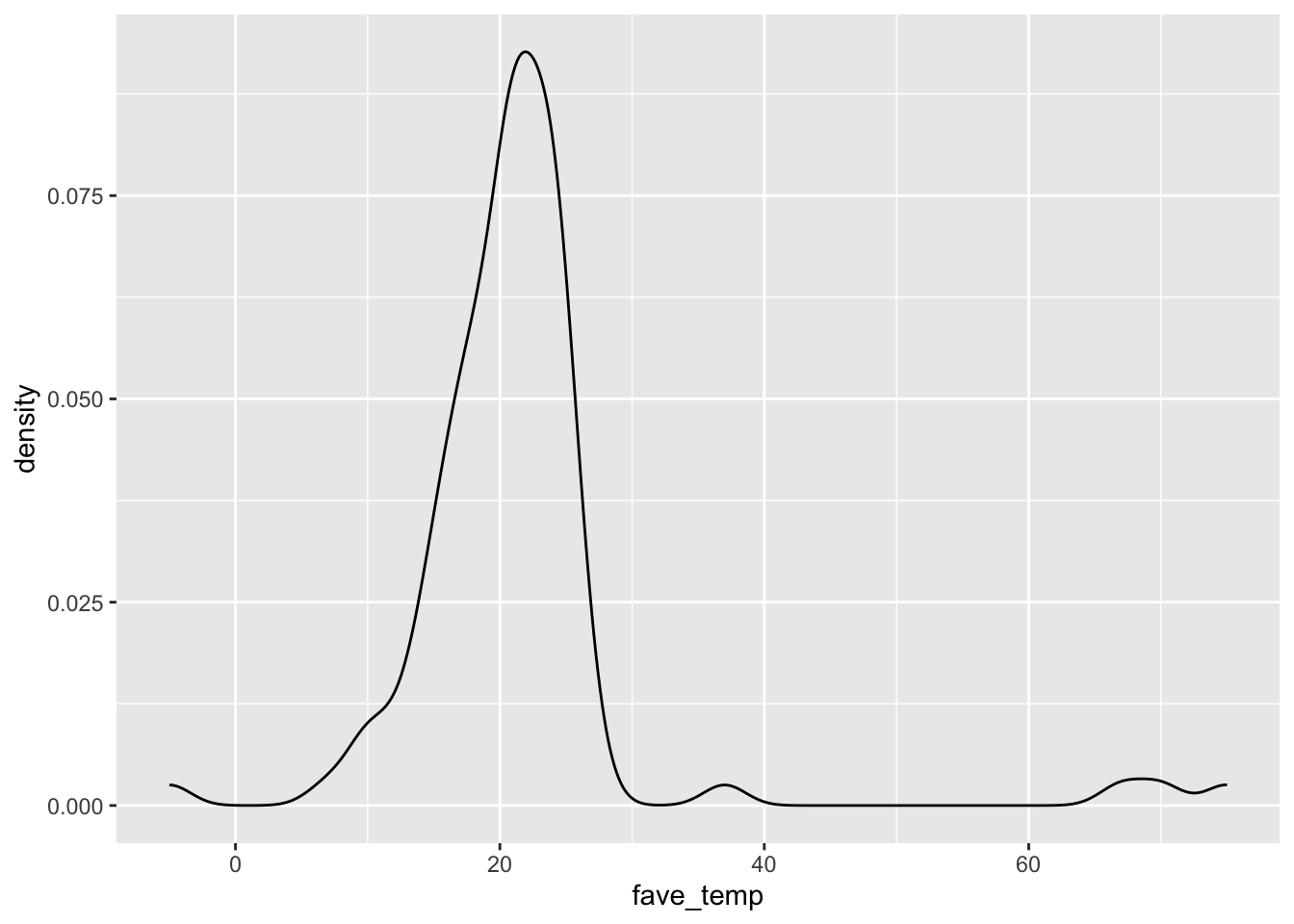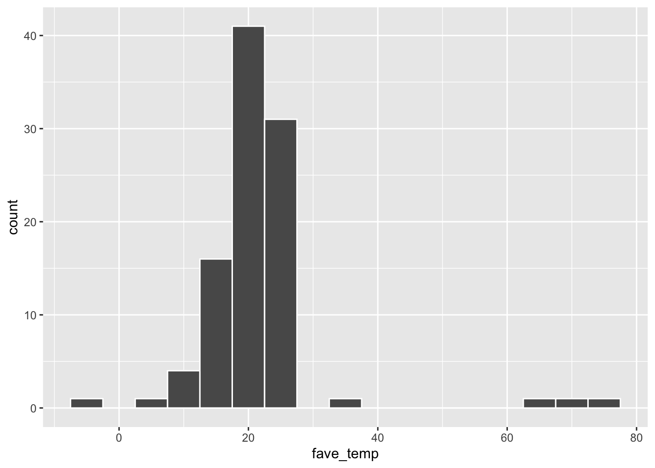 Students were asked about their ideal outdoor temperature, in degrees Celsius. How did they answer? What was the typical response? What was the range in responses? Were there any outliers? Build and interpret 2 plots that help address these questions.