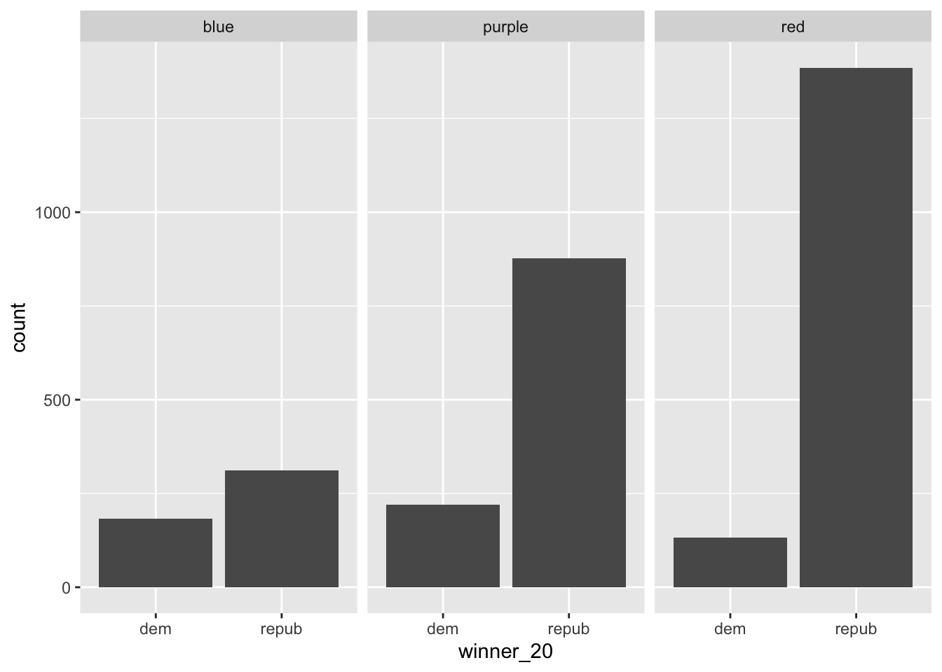 pro = easier to compare the relative outcomes in blue vs purple vs red states con = lose track of how many counties fall into blue vs purple vs red states