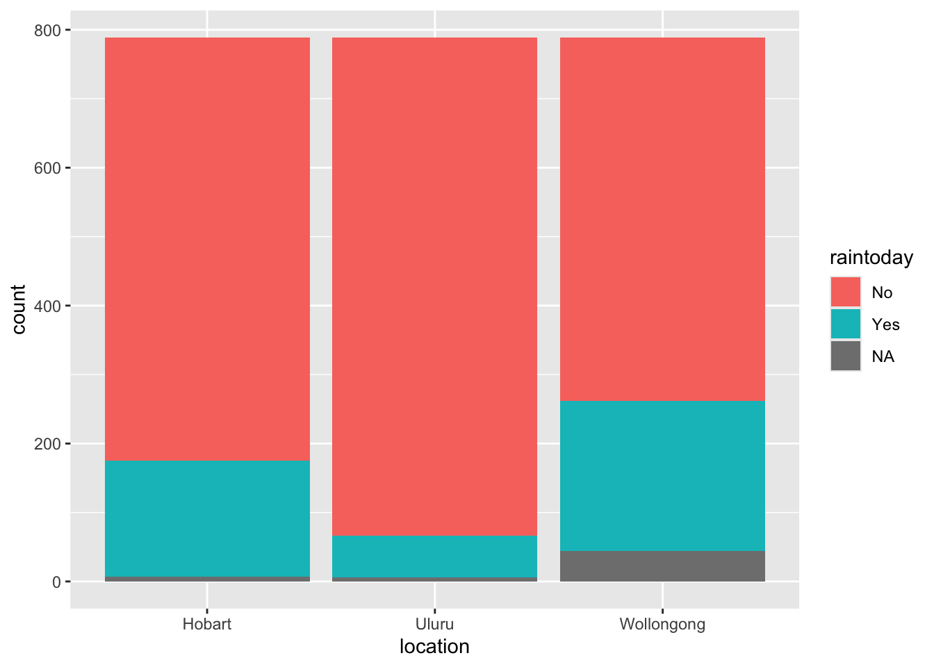 Think: How might we modify the below bar plot of location to distinguish between days on which it did or didn’t rain?