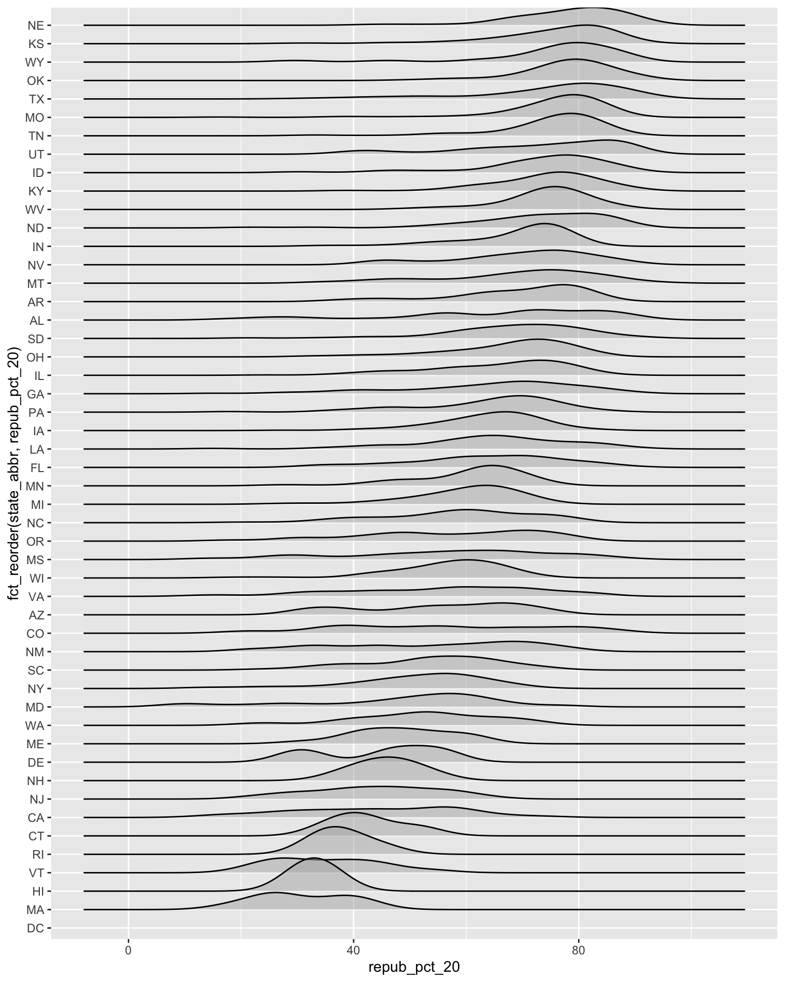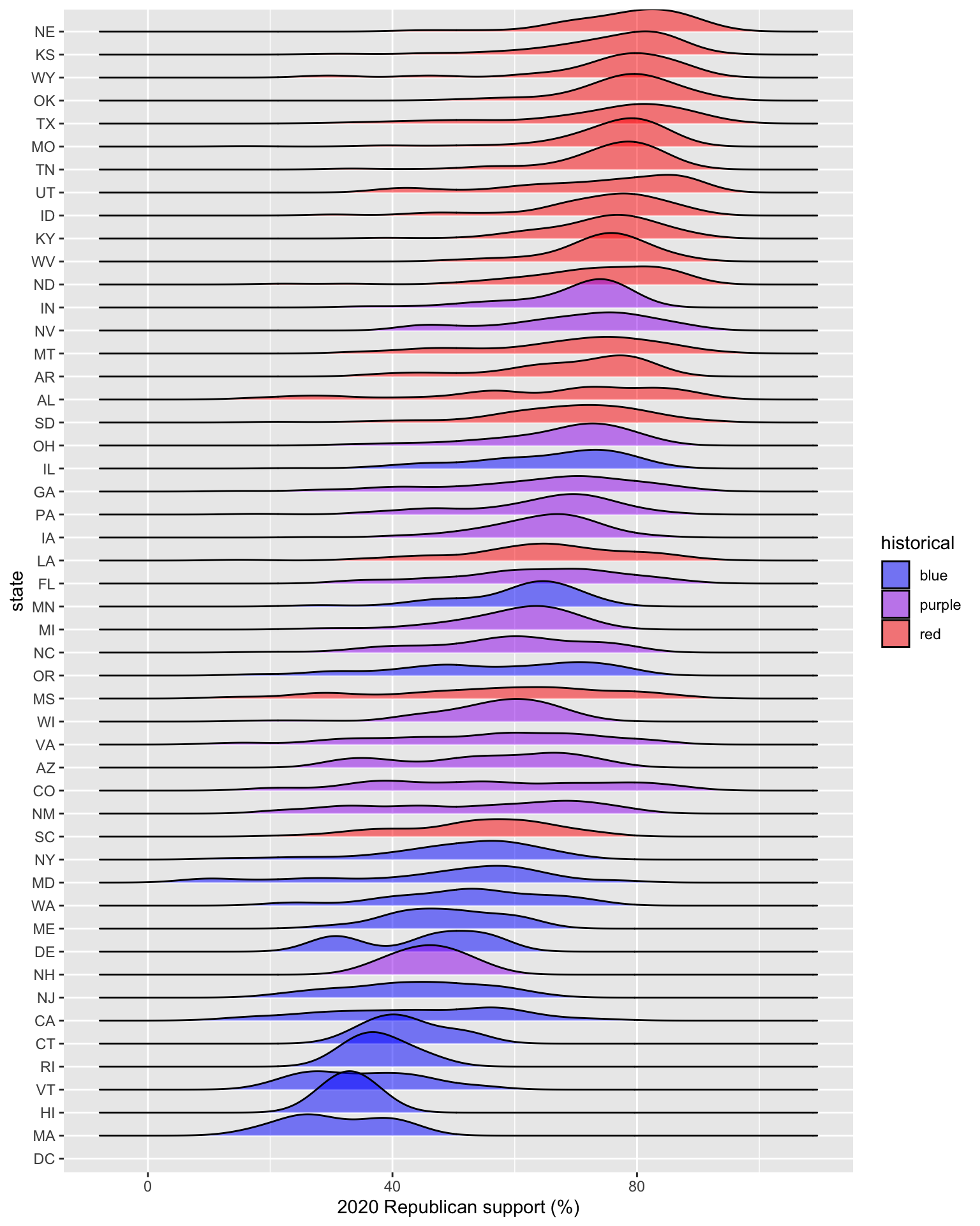 ggplot(elections, aes(x = repub_pct_20, y = fct_reorder(state_abbr, repub_pct_20), fill = historical)) +