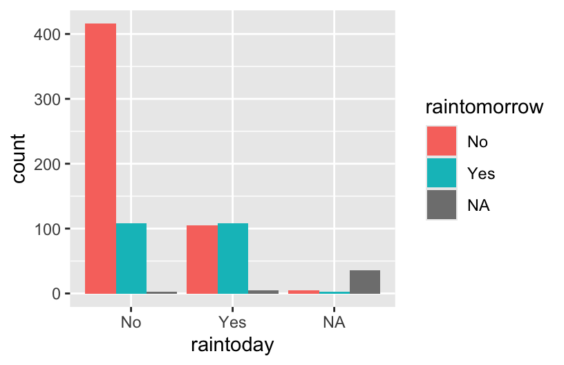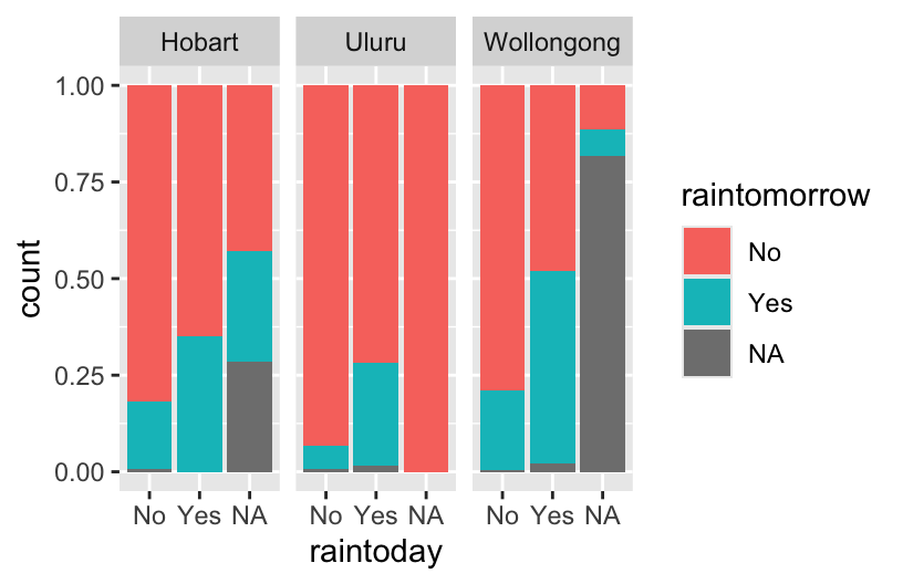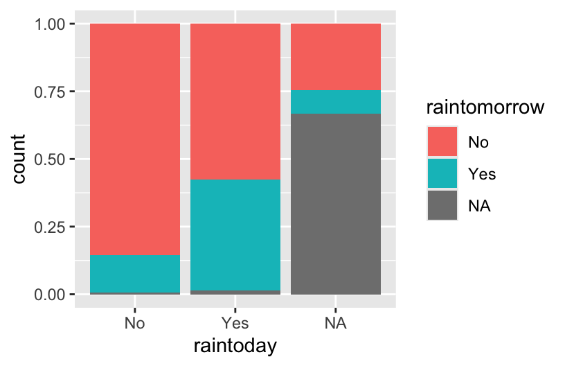 - The proportional / filled bars lose that information, but make it easier to compare proportions: it’s more likely to rain tomorrow if it also rains today.