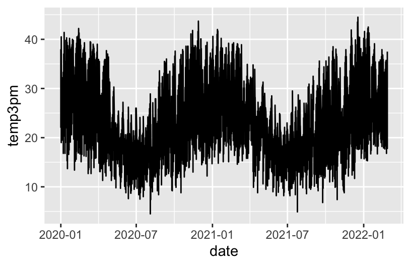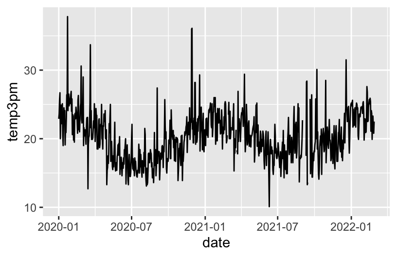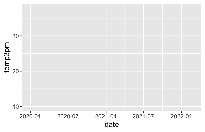 ggplot(weather, aes(y = temp3pm, x = date)) +