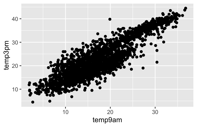 ggplot(weather, aes(y = temp3pm, x = temp9am)) +