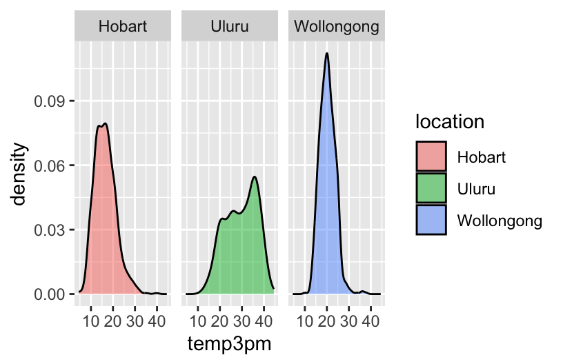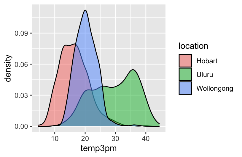 # Plot 1 (no facets & starting from a density plot of temp3pm)