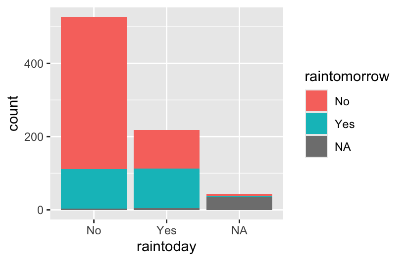 geom_bar(aes(fill = raintomorrow))