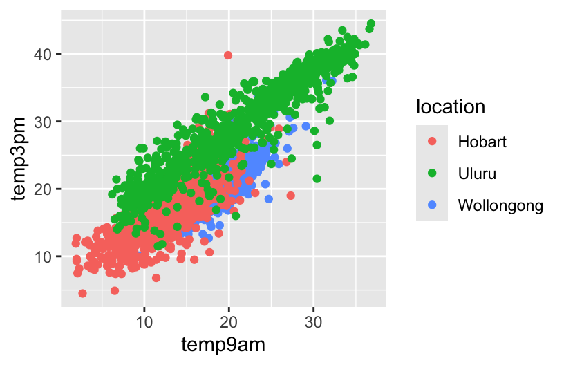 ggplot(weather, aes(y = temp3pm, x = temp9am, color = location)) +
