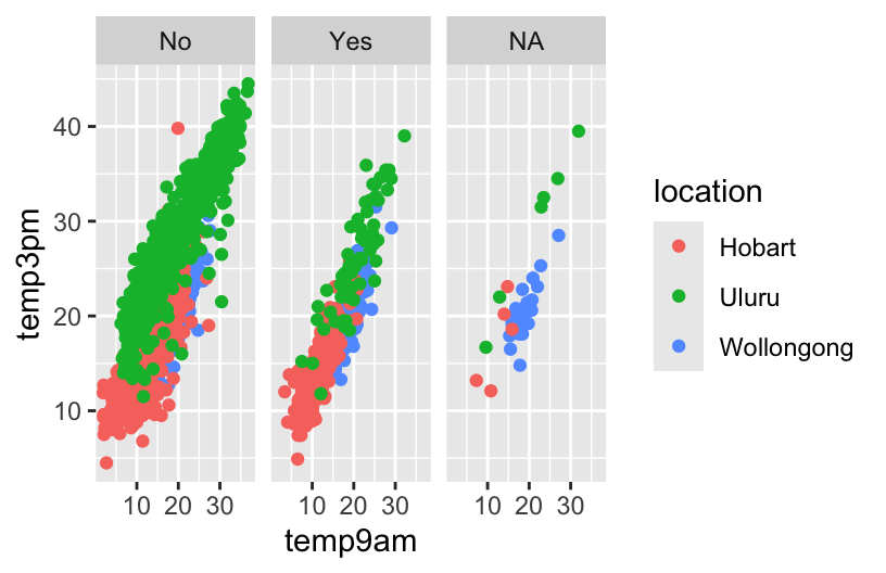 facet_wrap(~ raintoday)