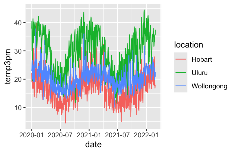 ggplot(weather, aes(y = temp3pm, x = date, color = location)) +