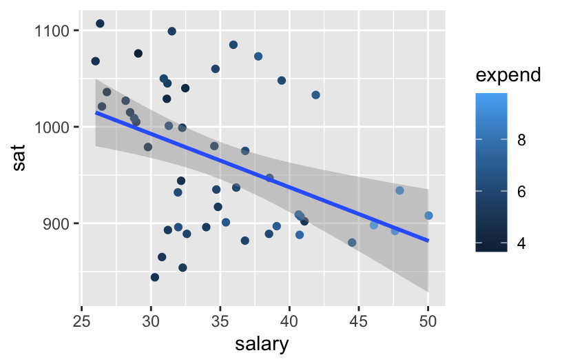 ggplot(education, aes(y = sat, x = salary, color = expend)) +