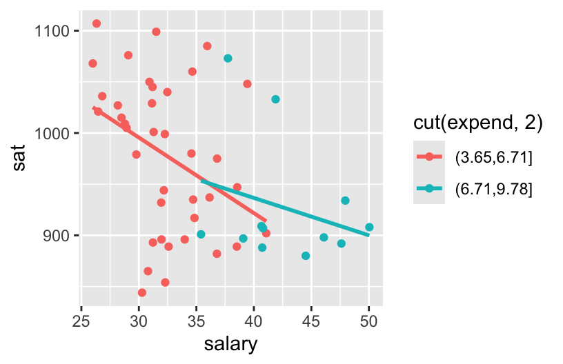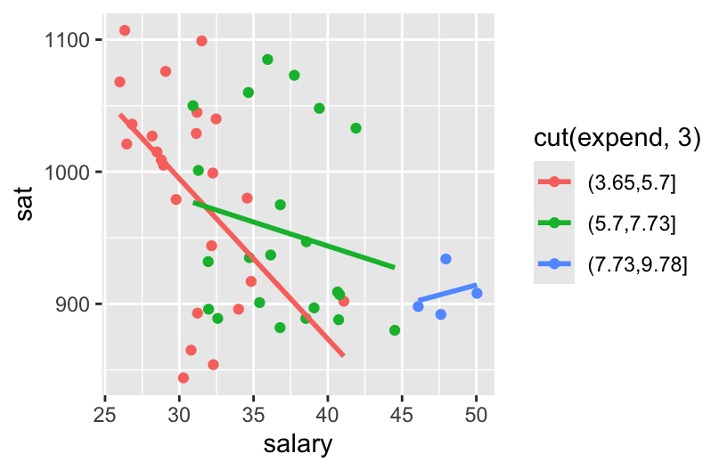 ggplot(education, aes(y = sat, x = salary, color = cut(expend, 3))) +