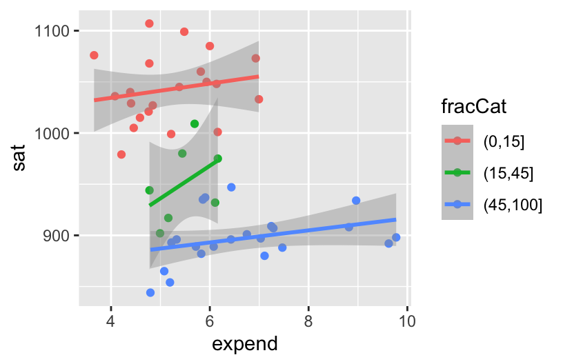 ggplot(education, aes(y = sat, x = expend, color = fracCat)) +