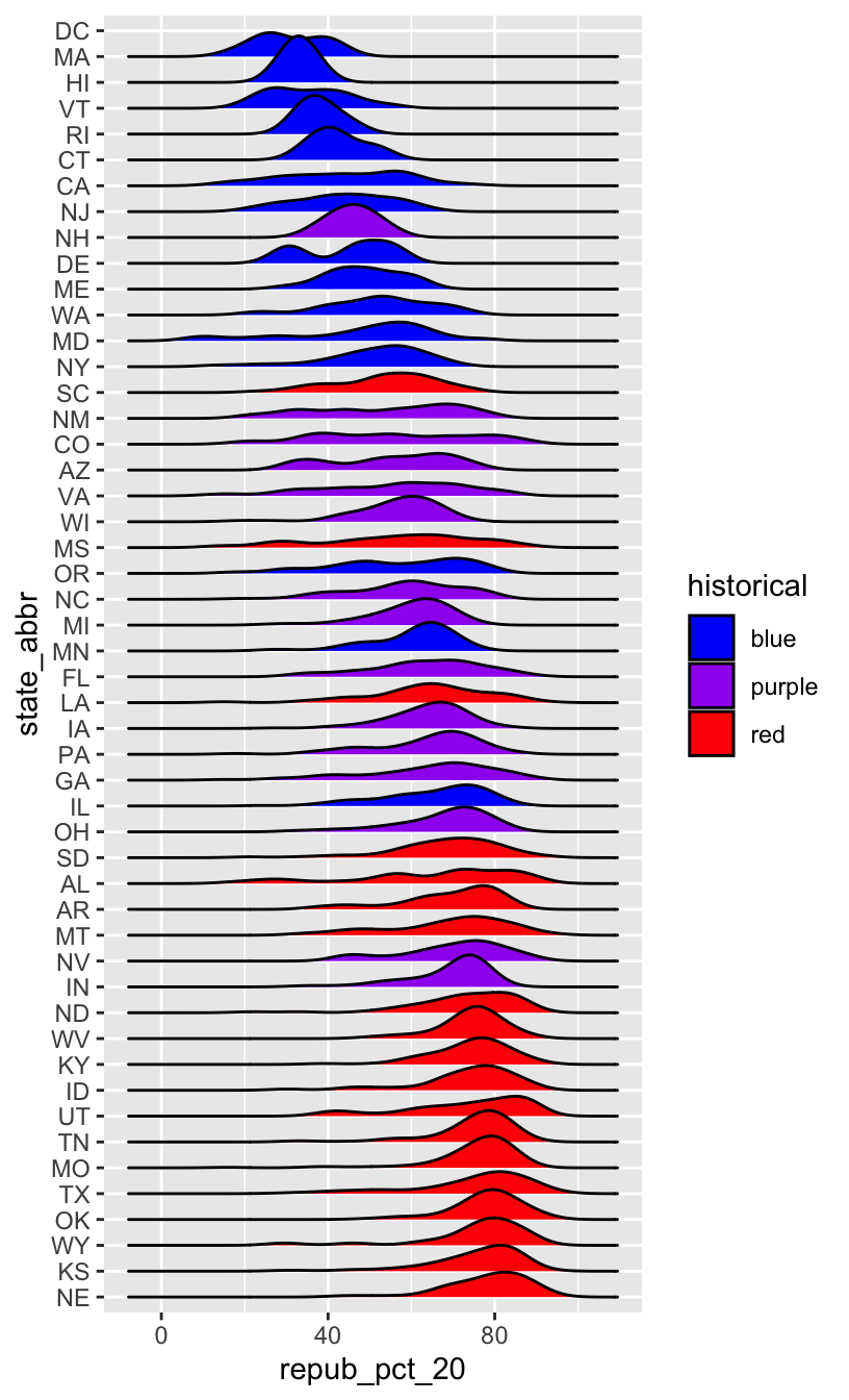 OK, but this is alphabetical. Suppose we want to reorder the states according to their typical Republican support. Recall that we did something similar in Example 2, using fct_relevel() to specify a meaningful order for the dem_support_20 categories: